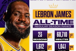 长河~詹姆斯常规赛出战赛季&时间&场次&得分&命中数 皆为历史第一