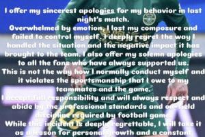 抓李镇全头发染红!米特里策向球队、球迷致歉,未直接向对手道歉