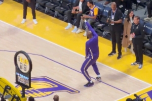 赛前热身环节,詹姆斯大秀曼妙舞姿,随后溜底线空接助飞海斯。