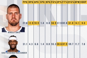 约基奇在场均篮板、助攻、投篮命中率、有效命中率、基础正负值(BPM)和替代球员价值(VORP)六项数据方面都排在四位MVP候选人中的首位。