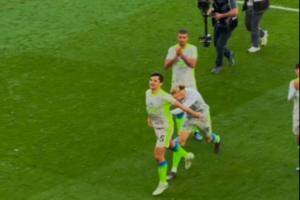 赛后曼城全队向球迷谢场时,胡桑诺夫有些不好意思接受球迷的掌声,哈兰德一把把他推到了球迷面前。
