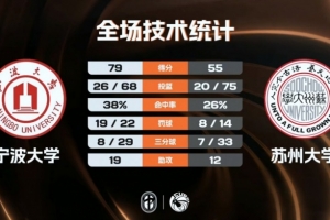末节比赛,苏州大学的进攻表现终于有所好转,他们能够与宁波大学展开拉锯,不过分差一直保持在二十分左右,苏州大学没有获得任何迫近比分的机会,最终宁波大学79-55轻取苏州大学成功晋级。
