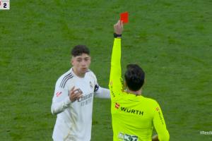 体育资讯03月23日讯 西甲第29轮马德里德比,皇马3-2逆转马竞。比赛中皇马中场巴尔韦德背后踢倒巴埃纳吃到直红。