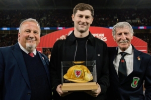 体育资讯3月28日讯 威尔士队向本·戴维斯颁发“金色帽子”,表彰他达成威尔士队出战100场里程碑。